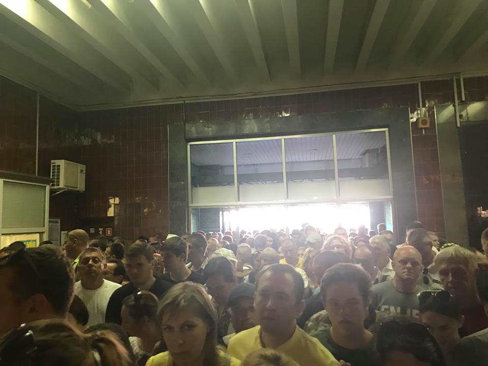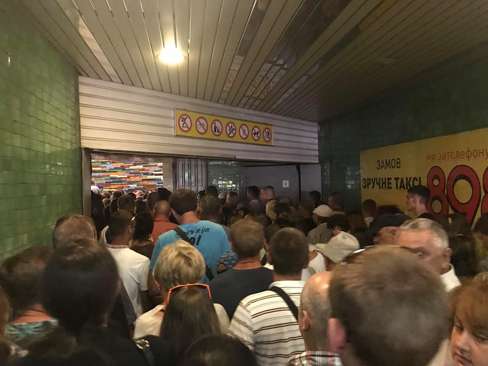 У входа в станцию образовались огромные очереди, а чтобы справиться с большим потоком людей сотрудникам метрополитена пришлось поставить у турникетов специальную кассу-копилку, куда люди бросали купюры по 8 гривен и проходили на перрон. Кассу-копилку используют в метро во время большого наплыва пассажиров. Емкость опечатана, из нее невозможно вытащить деньги. Их изымают сотрудники метро и вносят в кассу.