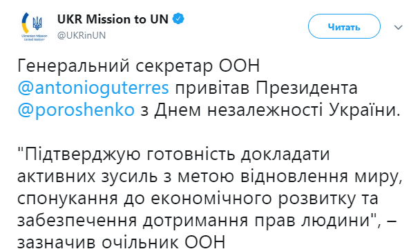 Также Генсек ООН направил президенту Украины Петру Порошенко поздравления с Днем независимости. Гутерреш также подчеркнул необходимость соблюдения прав человека.