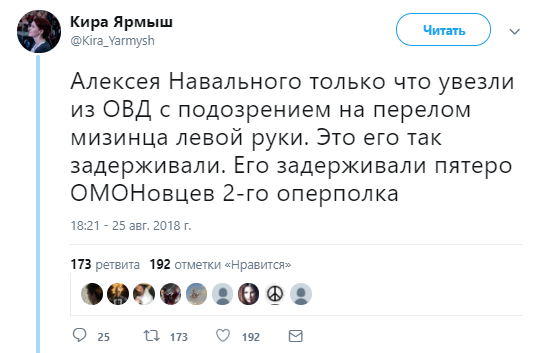 "Алексея Навального только вывезли из ОВД с подозрением на перелом мизинца левой руки. Это его так задерживали", - отметила она.