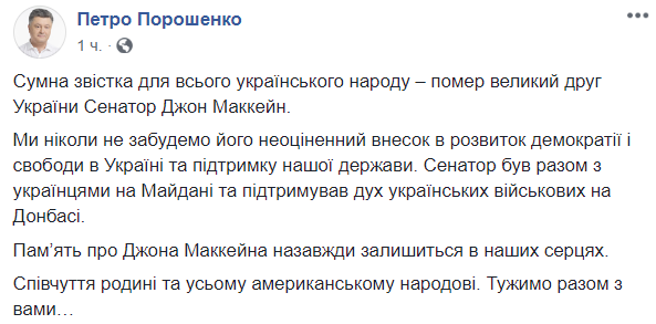 "Печальная новость для всего украинского народа - умер большой друг Украины Сенатор Джон Маккейн.