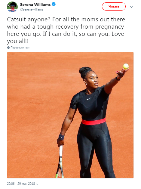 Серена Уильямс, которая в декабре 2017 года объявила о возвращении в профессиональный спорт после родов, выступала на последнем Открытом чемпионате Франции в обтягивающем черном костюме с красным поясом. Ее костюм вызвал критику со стороны президента Федерации тенниса Франции Бернара Джудичелли.
