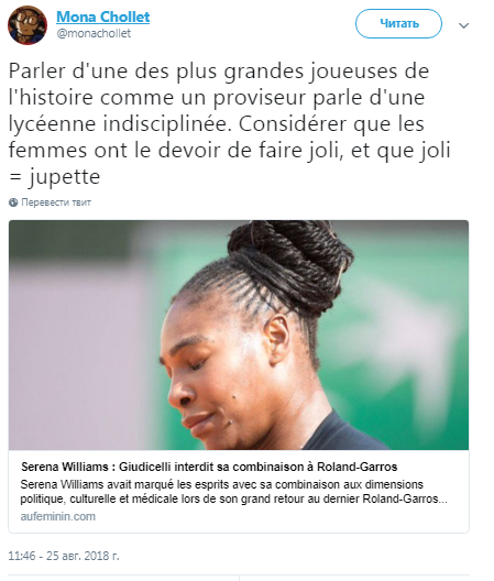 Однако его слова вызвали волну критики. Редактор газеты Le Monde Diplomatique Мона Шолле написала в Twitter, что он "говорит с одной из величайших теннисисток в истории, как директор говорит с недисциплинированной лицеистской".