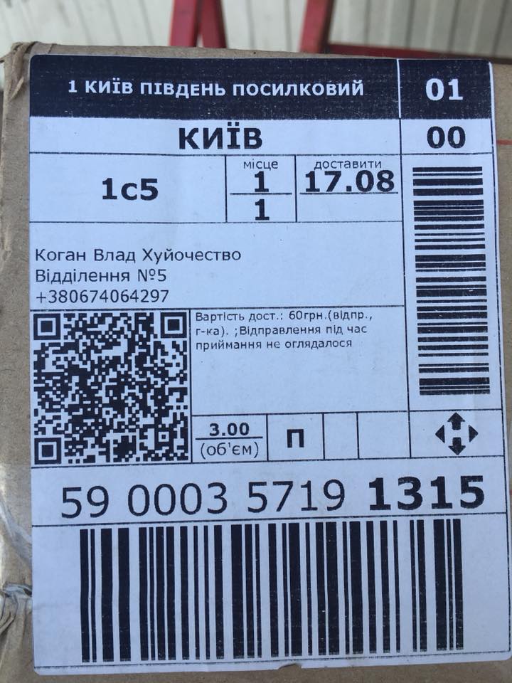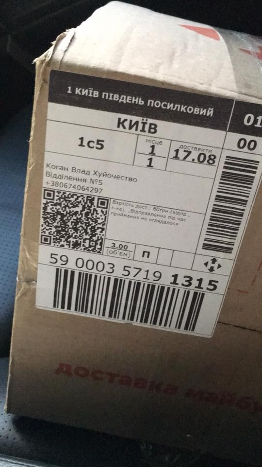 Об этом сам Влад Коган рассказал в Facebook. Посылка с данными получателя на имя "Коган Влад Ху*отчество" была отправлена из Кривого Рога.