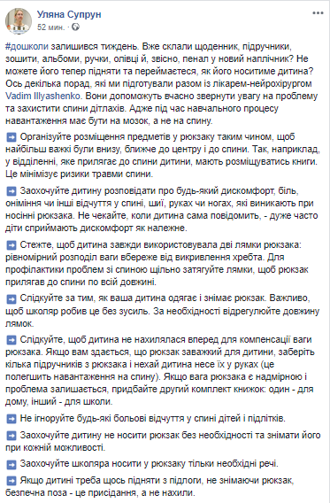 Накануне начала нового учебного года в Минздраве дали несколько советов, как защитить спины школьников от тяжелых рюкзаков. Рекомендации, разработанные вместе с врачом-нейрохирургом Вадимом Ильяшенко опубликованы на странице и.о. главы Минздрава Ульяны Супрун. По ее словам, "они помогут вовремя обратить внимание на проблему и защитить спины детей. Ведь во время учебного процесса нагрузка должна быть на мозг, а не на спину".