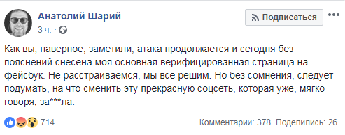 "Не расстраиваемся, мы все решим. Но без сомнения, следует подумать, на что сменить эту прекрасную соцсеть, которая уже мягко говоря, "за***ла", - сообщил Шарий.