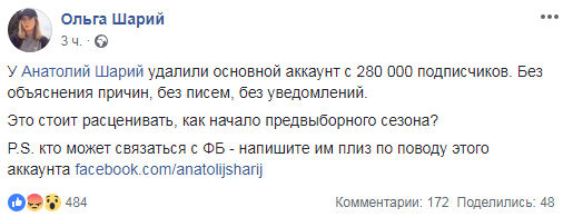 Его супруга Ольга Шарий подтвердила, что учетная страница была удалена из соцсети без объяснения причин. Она также попросила тех, кто может, написать в Facebook по поводу произошедшего с удаленным аккаунтом - facebook.com/anatolijsharij.
