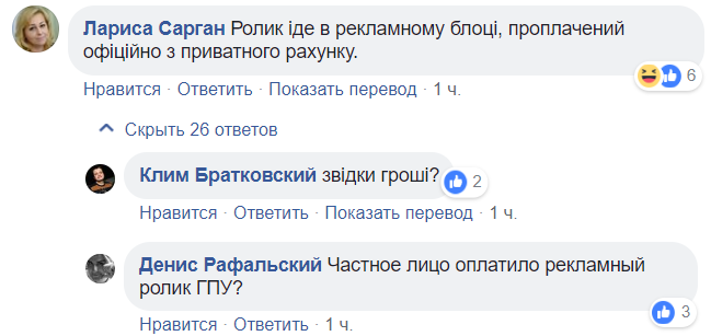 Лариса Сарган сначала заявила, что ролик оплатили в частном порядке, не уточнив, кто именно это сделал. "Ролик идет в рекламном блоке, оплаченный официально с частного счета", – написала она в комментариях у Яхно.