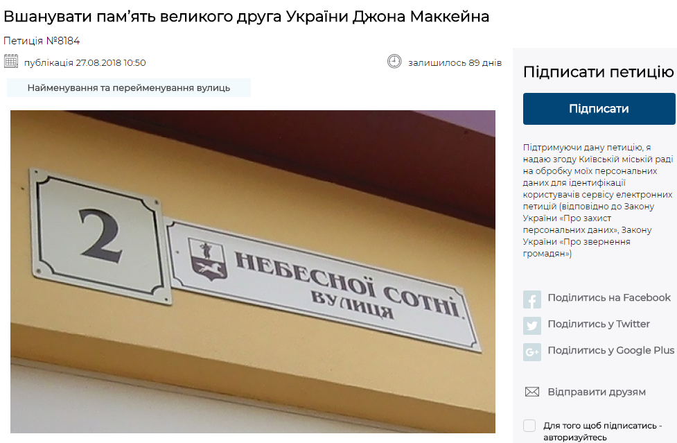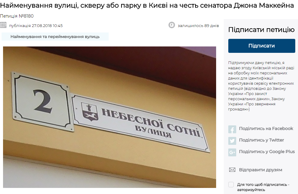 В понедельник, 27 августа, на сайте Киеврады зарегистрировали несколько петиций с просьбой присвоить различным объектам в Киеве имя американского политика Джона Маккейна. Он умер 25 августа 2018.