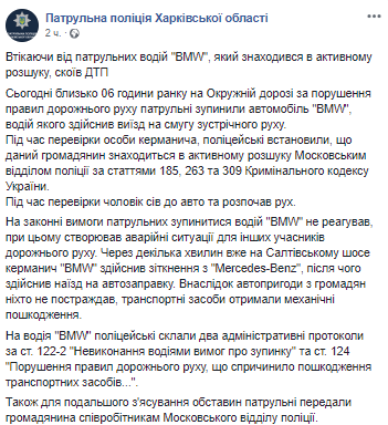 В Харькове при попытке скрыться на авто от полицейских находившийся в розыске мужчина  совершил ДТП. Об этом в соцсети сообщила пресс-служба патрульной полиции Харьковской области.
