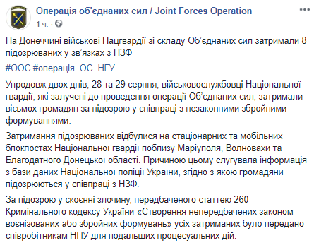 В сообщении говорится, что задержание состоялось 28 и 29 августа на стационарных и мобильных блокпостах Нацгвардии близ Мариуполя, Волновахи и Благодатного Донецкой области.
