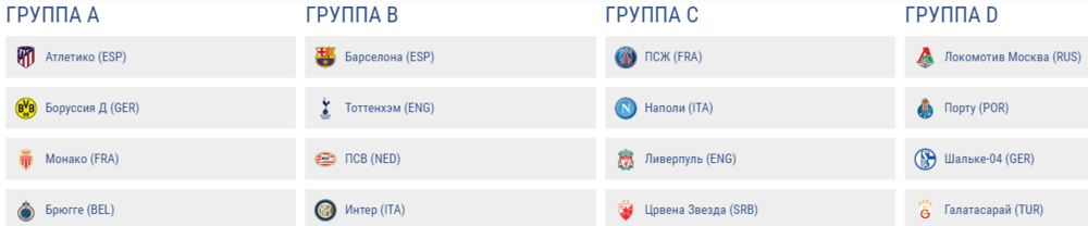 | Боруссия | Тоттенхэм | Наполи | Порту | Бенфика | Шахтер | Рома | Манчестер Юнайтед |
