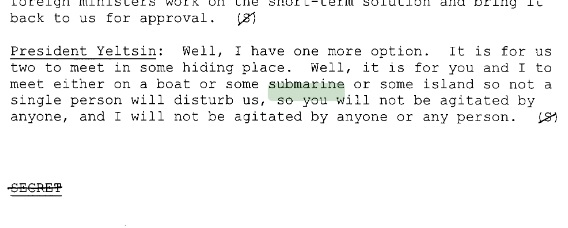 Так, например, из обнародованной стенограммы телефонного разговора Елцина и Клинтона во время кризиса, вызванного бомбежками Югославии самолетами НАТО в 1999 году, президент России предлагал коллеге провести тайные переговоры. Среди предложенных "уединенных" мест для встречи президентом фигурировала подводная лодка.