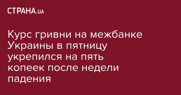 Курс гривни на межбанке Украины в пятницу укрепился на пять копеек после недели падения