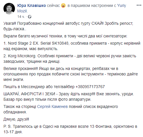 Из концертного автобуса группы "СКАЙ" украли музыкальную технику и инструменты. Об этом клавишник группы Юра Клавишко написал на своей странице в Facebook.