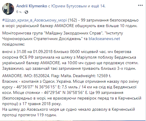В ночь на субботу, 1 сентября, береговая охрана ФСБ РФ задержала на пути из Мариуполя, возле Бердянска, украинский балкер Amadore. Об этом сообщил журналист Андрей Клименко в Facebook.