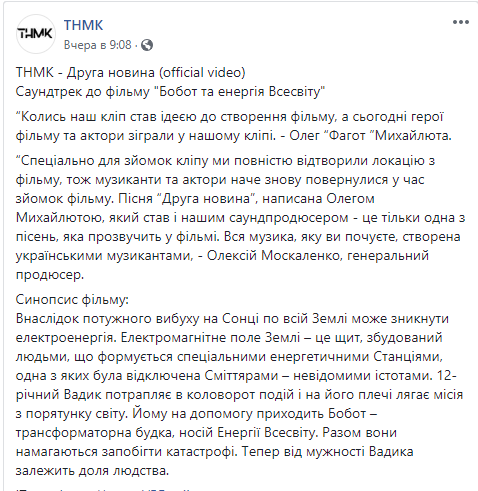 Группа ТНМК (Танок на майдані Конго) презентовала новый музыкальный клип на песню "Друга новина". Она стала саундтреком к украинскому приключенческому фильму Максима Ксенда "Бобот и энергия Вселенной". Об этом ТНМК сообщает на своей официальной странице в Facebook.