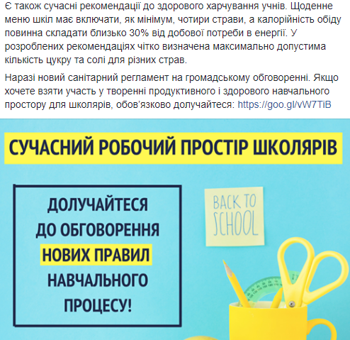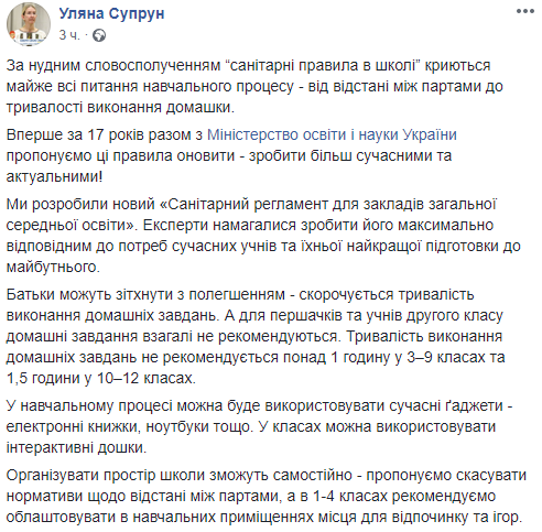 По словам Супрун, разработан новый "Санитарный регламент для учреждений общего среднего образования". В школах сокращается длительность выполнения домашних заданий: не более одного часа в 3-9 классах и 1,5 часа в 10-12 классах. А для первоклассников и учеников второго класса домашние задания вообще не рекомендуются.