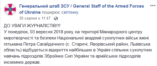 "В понедельник, 3 сентября 2018 года, на территории Международного центра миротворчества и безопасности Национальной академии сухопутных войск имени гетмана Петра Сагайдачного (с. Старичи, Яворовский район, Львовская область) состоится открытие самых масштабных в Украине совместных сухопутных учений подразделений Вооруженных Сил Украины и армейских подразделений иностранных государств", - говорится в сообщении.