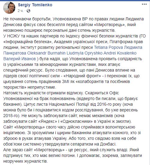 Он пишет, что сайт "Миротворец»" сначала воспринимался волонтерской инициативой, но  сейчас это ресурс, который служит власти. "Который поддерживает тех, кто имеет большие погоны. И помогает, в частности, запугивать неудобных журналистов", - подчеркивает председатель НСЖУ.
