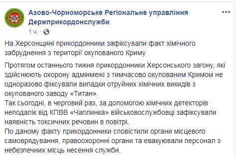 При этом в Азово-Черноморском региональном управлении Госпогранслужбы уточнили в Facebook, что наличие токсичных веществ пограничники зафиксировали недалеко от КПВВ "Чаплинка" на границе с Крымом. Там отмечают, что это не первый случай с завода "Титан", который находится на территории Крыма.