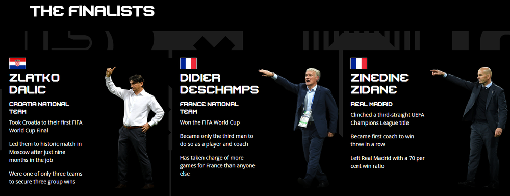 В числе номинантов были тренер сборной Англии Гарет Саутгейт, тренер "Ювентуса" Массимилиано Аллегри, тренер "Манчестер Сити" Хосеп Гвардиола, тренер "Ливерпуля" Юрген Клопп, тренер сборной Бельгии Роберто Мартинес, тренер "Атлетико" Диего Симеоне, тренер "Барселоны" Эрнесто Вальверде и тренер российской сборной Станислав Черчесов.