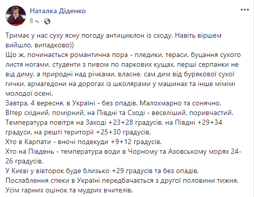 В Украине 4 сентября ожидается ясная и солнечная погода без осадков. Об этом написала синоптик Наталья Диденко на своей странице в Facebook.