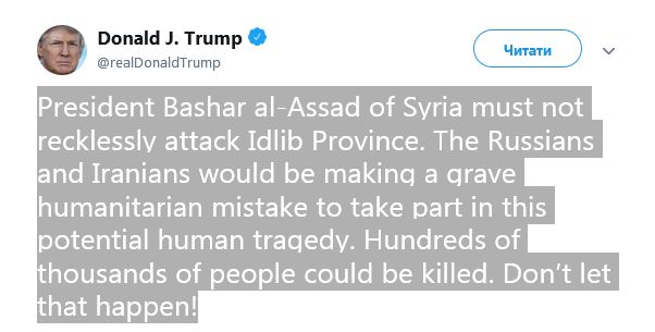 "Президент Сирии Башар аль-Асад не должен безрассудно атаковать провинцию Идлиб. Русские и иранцы совершили бы серьезную гуманитарную ошибку, если примут участие в этой потенциальной человеческой трагедии. Сотни тысяч людей могут быть убиты. Не позволяйте этому случиться!", - написал Дональд Трамп.