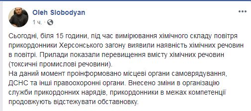 "Сегодня, около 15 часов, во время измерения химического состава воздуха пограничники Херсонского отряда обнаружили наличие химических веществ в воздухе. Приборы показали превышение содержания химических веществ (токсические промышленные вещества)", - сообщил Слободян.