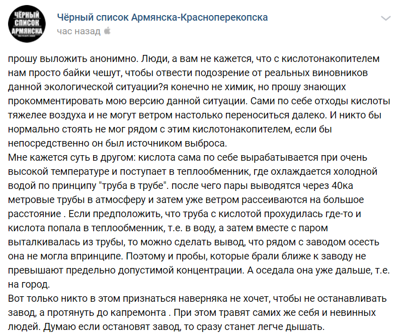 "Люди, а вам не кажется, что с кислотонакопителем нам просто байки чешут, чтобы отвести подозрение от реальных виновников данной экологической ситуации?я конечно не химик, но прошу знающих прокомментировать мою версию данной ситуации. Сами по себе отходы кислоты тяжелее воздуха и не могут ветром настолько переноситься далеко. И никто бы нормально стоять не мог рядом с этим кислотонакопителем, если бы непосредственно он был источником выброса.