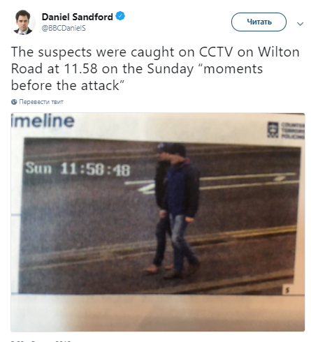 В сообщении говорится, что одозреваемые были сняты на камеры видеонаблюдения на Уилтон-роуд в 11:58 в воскресенье непосредственно перед тем, как было совершено покушение на Скрипалей.