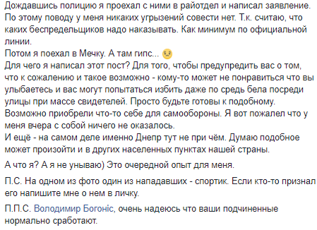 Олег Чистопольцев успел сфотографировать нападавших, их машину. Он очень рассчитывает на быстрое и эффективное расследование. Также он предупреждает пользователей о том, что надо быть готовым к таким ситуациям, когда кому-то не понравится то, как ты улыбаешься.