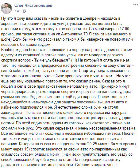 "Из-за численного физического перевеса им пару раз удалось сбить меня с ног и нанести несколько акцентированных ударов ногами. По всей видимости, одним из которых, как оказалось позже, они сломали мне руку", - заявил пострадавший.