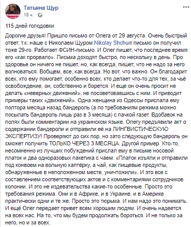 "Дорогие друзья! Пришло письмо от Олега от 29 августа. Очень быстрый ответ, т. к. наше с Николаем Щуром письмо он получил тоже 29-го. Работает ФСИН-письмо. И Олег пишет, что в последнее время его "как прорвало". Письма доходят быстро, по нескольку в день. Про здоровье он ничего не пишет, но, как всегда, пишет, что не надо за него волноваться. В общем, все, как всегда. Но вот что важно. Он благодарит всех, кто ему помогает, особенно всех, кто делает что-то для тех, за чьё освобождение, он собственно и борется", - сообщила она.