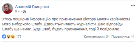 Позднее сам нардеп в своем комментарии в Facebook, отвечая на вопрос о том, соответствует ли действительности сообщение о его назначении главой избирательного штаба Гриценко, написал: "Нет".