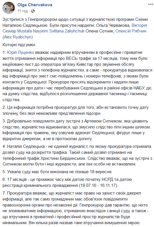 "1. Короткие итоги. Юрий Луценко считает чрезмерным вмешательством в профессиональную и частную жизнь получения информации о всем трафике за 17 месяцев, поэтому им было инициировано письмо к оператору связи "Киевстар" о сужении объема информации, снятой с телефона журналистки, а именно - прокуратура отказалась от информации о содержание смс-сообщений и номерах телефонов, с которыми были контакты у Седлецкой. Прокуроры просят отделить и предоставить лишь информацию о датах и ​​времени пребывания Седлецкой в ​​районе офисов НАБУ, где, по мнению следствия, произошло разглашение государственной тайны и тайны следствия.