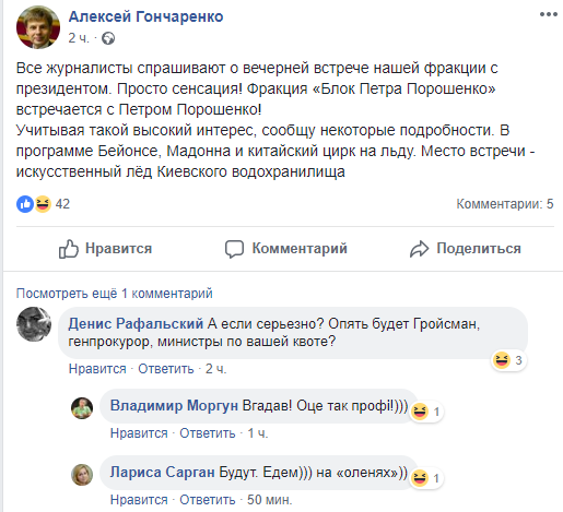Место проведения встречи во фракции не разглашали. Нардеп Алексей Гончаренко заявил, что не знает места, поскольку всех туда повезут на автобусе. На своей странице в Facebook он решил расширить шутку: "Учитывая такой высокий интерес, сообщу некоторые подробности. В программе Бейонсе, Мадонна и китайский цирк на льду. Место встречи - искусственный лед Киевского водохранилища".