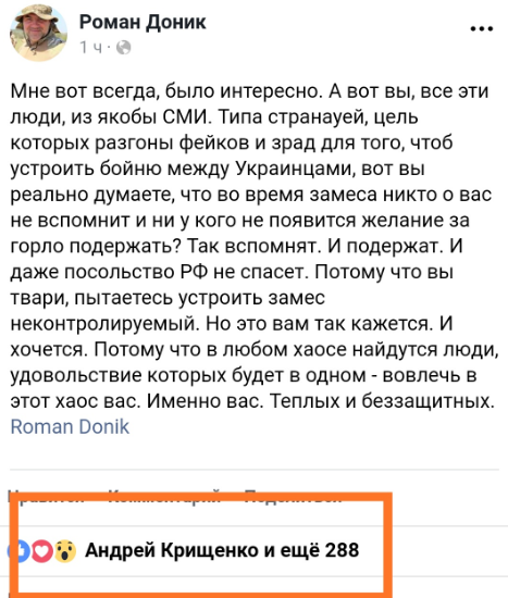 "Мне вот всегда, было интересно. А вот вы, все эти люди, из якобы СМИ. Типа странауей, цель которых разгоны фейков и зрад для того, чтоб устроить бойню между Украинцами, вот вы реально думаете, что во время замеса никто о вас не вспомнит и ни у кого не появится желание за горло подержать? Так вспомнят. И подержат. И даже посольство РФ не спасет. Потому что вы твари, пытаетесь устроить замес неконтролируемый. Но это вам так кажется. И хочется. Потому что в любом хаосе найдутся люди, удовольствие которых будет в одном - вовлечь в этот хаос вас. Именно вас. Теплых и беззащитных", - написал Доник.