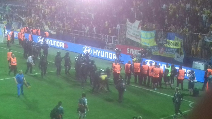 Причиной арестов стало то, что самые активные фанаты пытались прорваться на поле. После короткой стычки с полицией, наши фаны со своего сектора забросали полицейских мусором.