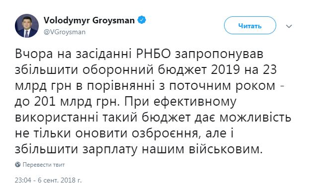 Премьер-министр Владимир Гройсман заявил, что военный бюджет Украины в 2019 году вырастет на 23 миллиарда гривен и составит сумму в 201 миллиард гривен. Об этом сообщил премьер-министр Владимир Гройсман в Twiiter 7 сентября.