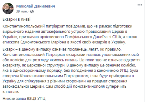 "Сегодня, 7 сентября 2018 года, Константинопольский Патриархат официально сообщил, что «в рамках подготовки решенного предоставления автокефального устройства Православной Церкви в Украине, назначил архиепископа Памфильського Даниила из США, а также епископа Эдмонтонского Илариона из Канады в качестве своих экзархов в Киев. По благословению Блаженнейшего Митрополита Киевского и всея Украины Онуфрия, Отдел внешних церковных связей Украинской Православной Церкви уполномочен заявить, что назначение экзархов является грубым нарушением канонической территории Украинской Православной Церкви. Данное решение Константинопольского Патриархата противоречит 2-му правилу Второго Вселенского (Константинопольского) Собора: "Не будучи приглашенными, епископы да не переходят за пределы своей области", - говорится в сообщении