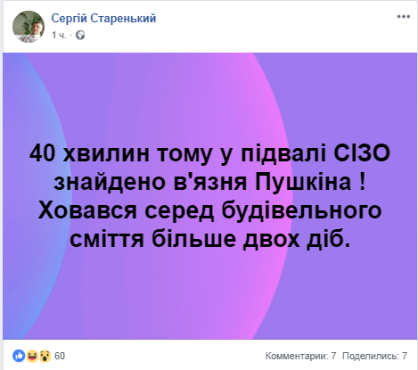 8 сентября, спустя 2 дня после исчезновения, был найден 19-летний Виталий Пушкин, которого ранее недосчитались в Лукьяновском СИЗО. Об этом сообщил экс-начальник пенитенциарной службы Сергей Старенький на своей странице в Facebook.