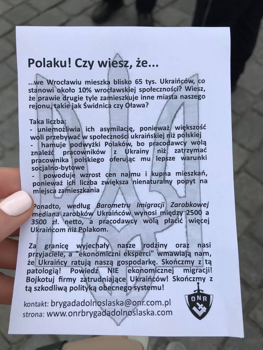На митинге раздавали листовки, в которых отмечали, что во Вроцлаве при количестве населения чуть более 600 тысяч человек, проживает около 60 тысяч украинцев (около 10% города). В ней говорилось, что из-за наплыва украинцев растут цены на аренду жилья, а поляки теряют рабочие места. Организаторы митинга призвали сказать "нет" экономической миграции и бойкотировать фирмы, которые берут на работу украинцев.