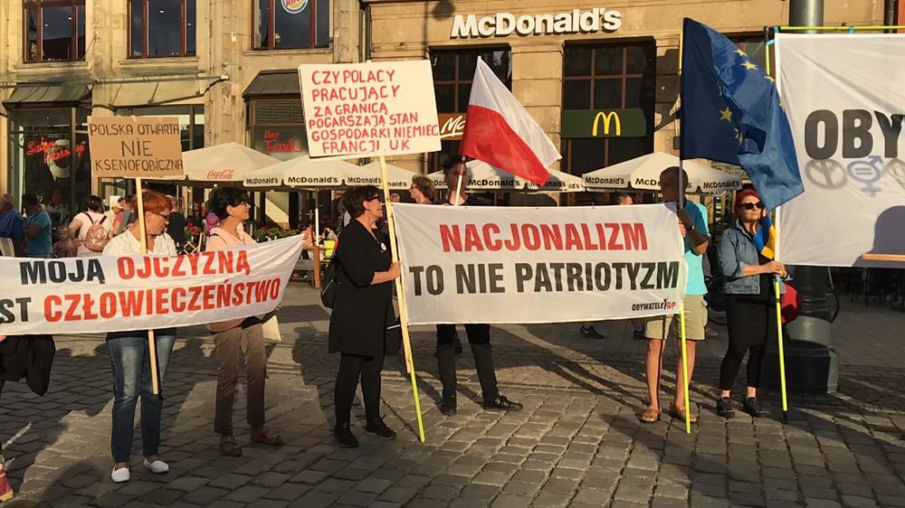 При этом рядом собрался митинг против митинга, на который пришло около 25 человек. Люди держали в руках плакаты с надписями, что "национализм - это не патриотизм", а также задавались вопросом, ухудшают ли поляки, работающие за границей, состояние дел в Германии и Франции. Обошлось без столкновений.