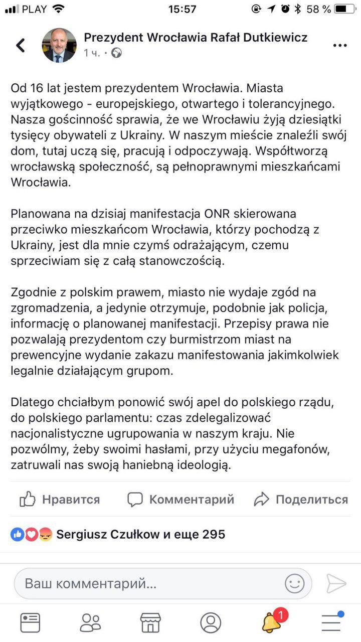 Стоит отметить, что за несколько часов до начала мероприятия мэр Вроцлава в Facebook написал, что не поддерживает митинг против украинцев и считает его организаторов провокаторами.