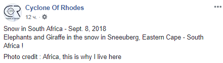 Климат преподнес очередной сюрприз. Капскую провинцию Южно-Африканской Республики неожиданно накрыл фронт холодного воздуха, который принес стране обильные снегопады. В частности, 8 сентября снег выпал в природном заповеднике Sneeuberg Nature Reserve в ЮАР. Об этом сообщает сообщество Cyclone of Rhodes в Facebook.