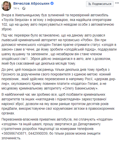"Криминальный авторитет прибыл из столицы Чечни из Российской Федерации - города Грозный с целью выполнить поручение его покровителя "Гелани": каждый перевозчик, который осуществляет перевозки в направлении России, "государств ДНР-ЛНР", оккупированного Крыма должен платить ему, а не местному криминальному авторитету "Олегу Бакинскому", - указано на странице Аброськина в Facebook.