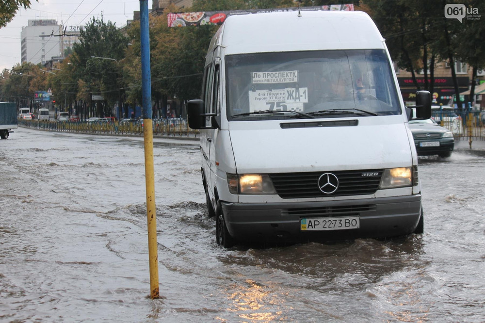 На опубликованных в сети фото видно, как автомобили "переплывают" перекресток проспекта Соборного и улицы Лермонтова. Людям, чтобы выйти из маршруток, пришлось прыгать прямо в лужи.