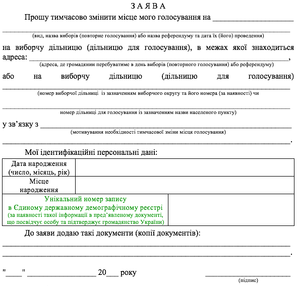 Как видно из образца, помимо заполнения полей, украинец должен приложить документы, которые подтверждают необходимость временного изменения места голосования. В случае с переселенцами речь идет о справке переселенца.