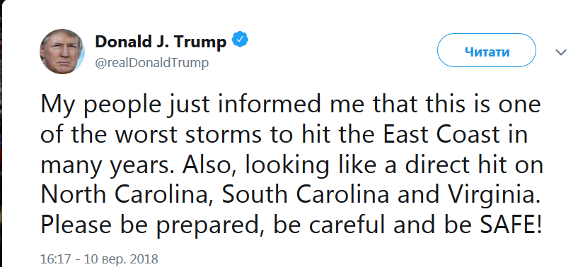 Трамп отметил, что ураган нанесет "прямой удар" по Южной Каролине, Северной Каролине и Вирджинии. Он призвал жителей штатов приготовиться к стихийному бедствию и пожелал им быть в безопасности.
