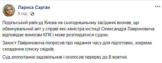 Защита Лавриновича попросила о предоставлении времени для подготовки, в частности для составления списка свидетелей. Суд ходатайство удовлетворил и объявил перерыв до 8 октября", - заявила Лариса Сарган.